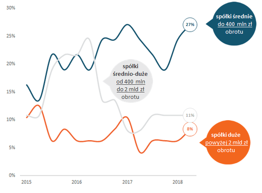 Największej presji podlegają firmy średnie i mniejsze. W tej grupie rośnie odsetek podmiotów, które przynoszą straty. Wśród firm giełdowych, odsetek firm znajdujących się „pod wodą” wzrósł w ostatnich latach z 15% do 27%, mimo bardzo szybkiego wzrostu przeciętnego poziomu zysków. To zjawisko nie jest widoczne wśród firm średnio-dużych i dużych.